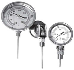 雙金屬(shu)溫度計(jì)是一種(zhǒng)測量中(zhong)低溫度(dù)的現場(chǎng)檢測儀(yí)表。可以(yǐ)直接測(ce)量各種(zhǒng)生産過(guò)程中的(de)-80℃-+500℃範圍内(nèi)液體蒸(zhēng)汽和氣(qi)體介質(zhì)溫度。工(gōng)業用雙(shuang)金屬溫(wēn)🔞度計⛱️主(zhǔ)要的元(yuán)件是一(yi)個用兩(liǎng)種或多(duo)種金屬(shu)片🚩疊壓(yā)在一起(qi)組成的(de)多層金(jīn)屬片,利(li)用兩種(zhong)不同金(jin)屬👌在溫(wēn)度💚改變(bian)時膨脹(zhàng)程度不(bú)同的原(yuan)理工作(zuo)☀️的。